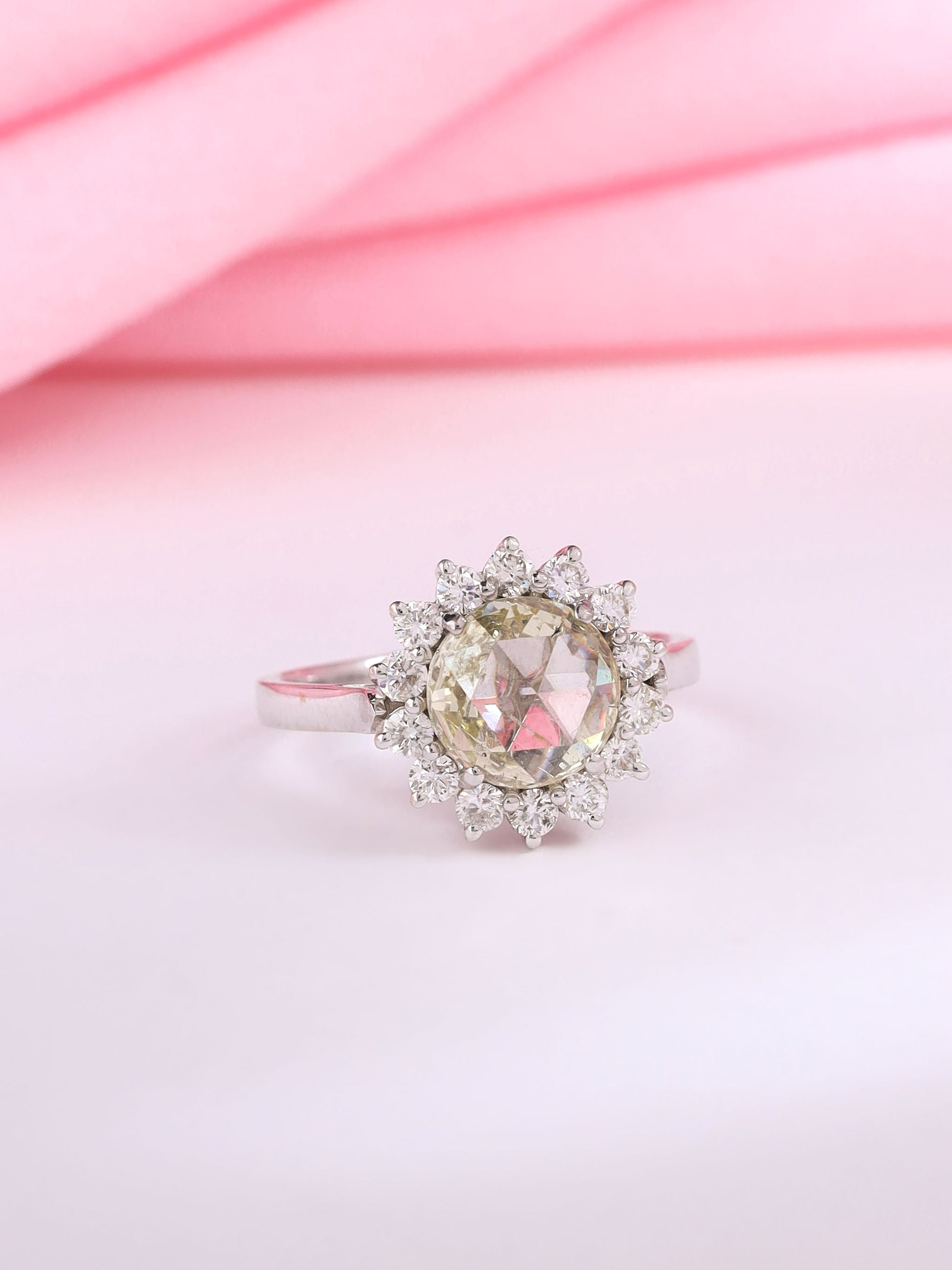 Immerse yourself in the enchanting beauty of our Diamond Florate Ring, an exquisite piece inspired by the allure of blooming flowers. Meticulously handcrafted, this ring showcases a spectacular display of diamonds, meticulously chosen to embody the essence of each petal. With meticulous precision, our skilled technicians have intricately designed the playful petals, adding a touch of artistry and uniqueness to this exceptional piece. Embrace the radiance and elegance of this ring, as it blossoms upon your finger, capturing the essence of nature's most captivating marvels.